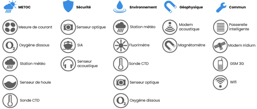 Plateforme ‘’tout temps’’ se propulsant par effet de houle. Système doté d’un réseau de capteurs pour collecter des données en temps réel. Capable de réaliser des missions d’ordre météorologique, environnemental, géophysique et sismique, de suivi des mammifères marins, de sécurité et de surveillance d’aires marines, d’aide à la pêche, etc.